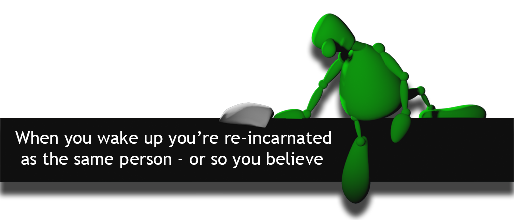 This reality to which you return on your death is the one in which ‘you’ remember all of characters you are. If this is so, then you realise, there’s no such thing as ‘re’ incarnation and you don’t come ‘back’. You’re always there. So it’s probably a good idea to act as if you have one shot at life and that’s it!